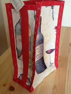Con il filo da imbastitura applico lo sbieco su tutte le cuciture di giunzione tra i lati e alla base del portabottiglie . Ora posso cucire e il lavoro è terminato!