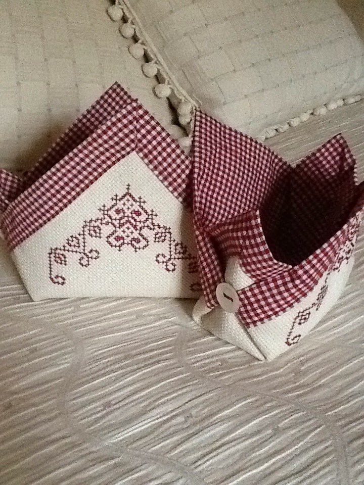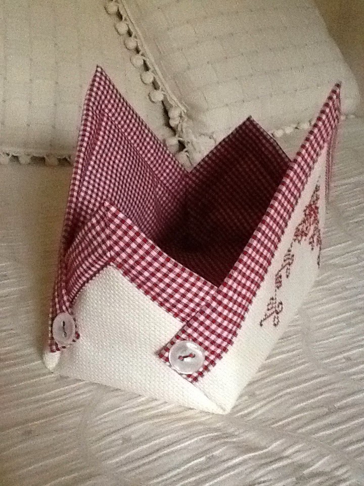 Se si preferisce un contenitore più grande, si può utilizzare un quadrato di tela aida di 35 cm, procedendo come sopra; per dare maggior sostegno al contenitore è consigliabile applicare una flisellina termoadesiva leggermente imbottita alla stoffa a quadretti.