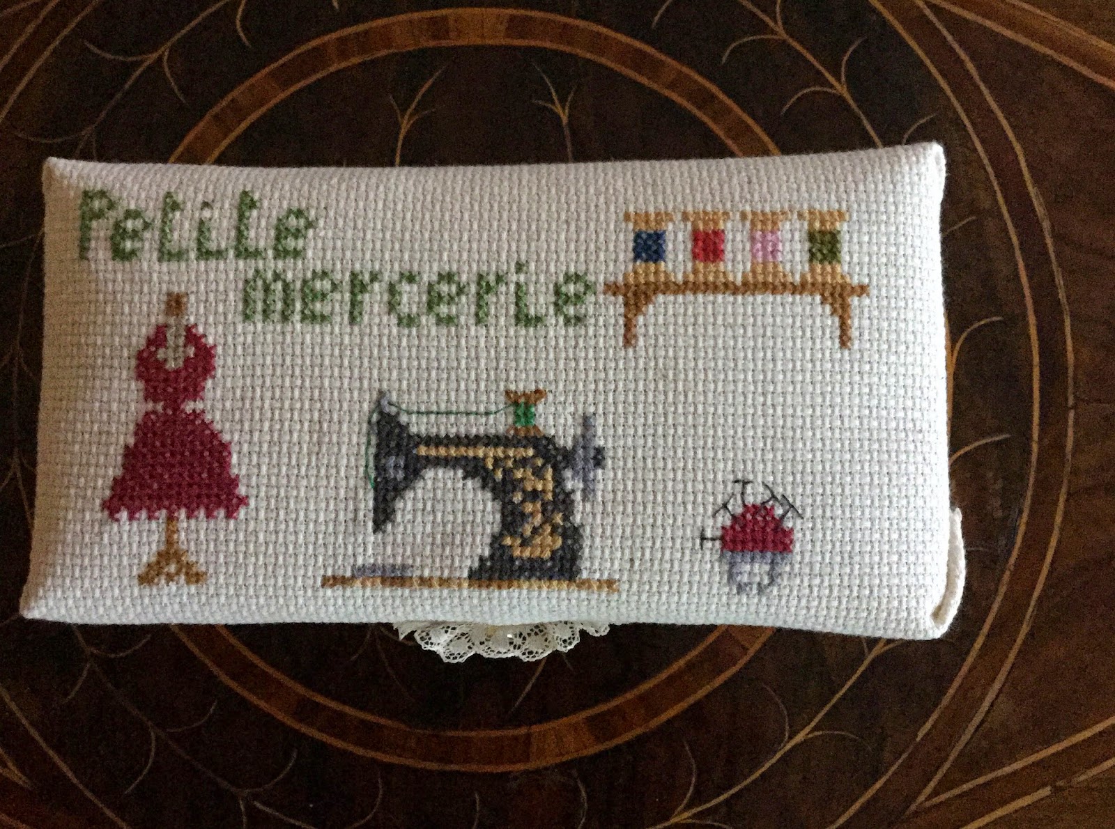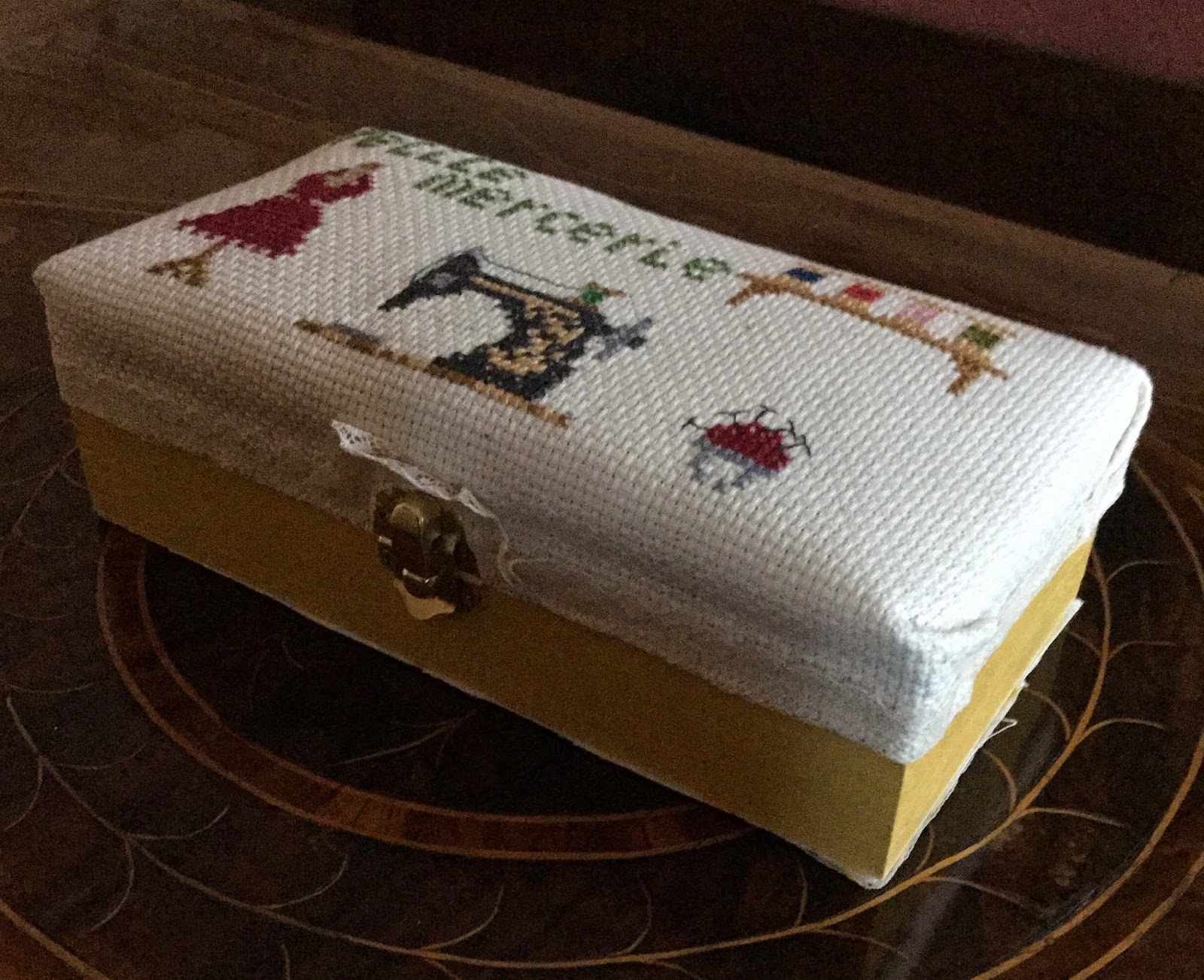 Ho ricoperto il coperchio di una robusta scatola di cartone con tela aida che avevo precedentemente ricamato con motivi inerenti al cucito, frapponendo comunque uno strato di imbottitura sintetica. Con colla vinilica ho fermato la stoffa tutto intorno e ho aggiunto la finitura consistente in un giro di pizzo e uno di nastrino in velluto. Poi ho rivestito l'interno della scatola con stoffa in tema...