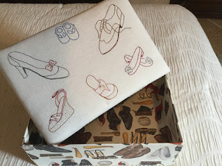 Dove tenere vasetti di lucido per le scarpe, spazzole, panni per lucidare? vi propongo di utilizzare una robusta scatola da scarpe...la rivestite all'interno e all'esterno con una carta a vostra scelta, ma se ne trovate una in tema è meglio! sul coperchio incollate una leggera imbottitura e poi vi applicate una stoffa , incollandola lungo tutti i bordi del coperchio, dove avete ricamato varie scarpe colorate....ecco il risultato